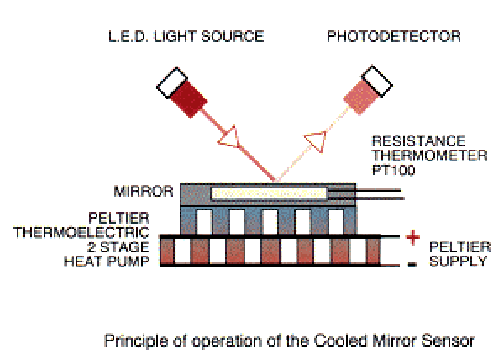 Dew point The amount of moisture in a volume can be determined with the dew point method by cooling a mirror. The dew point, where condensation starts on the mirror, can be detected by reflectivity measurements. Tables give the concentration of water in dependence on the dew point. Example www.michell.co.uk |